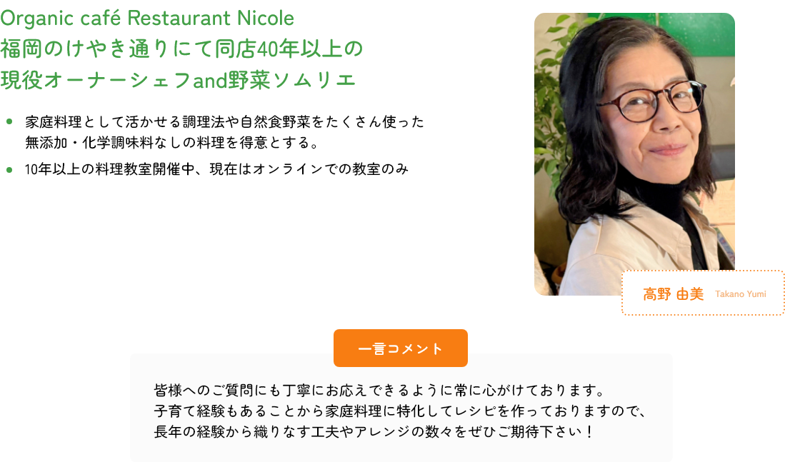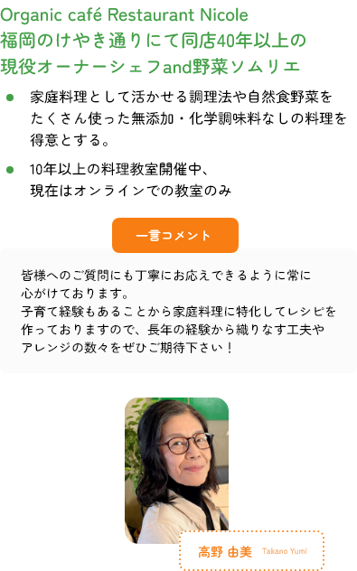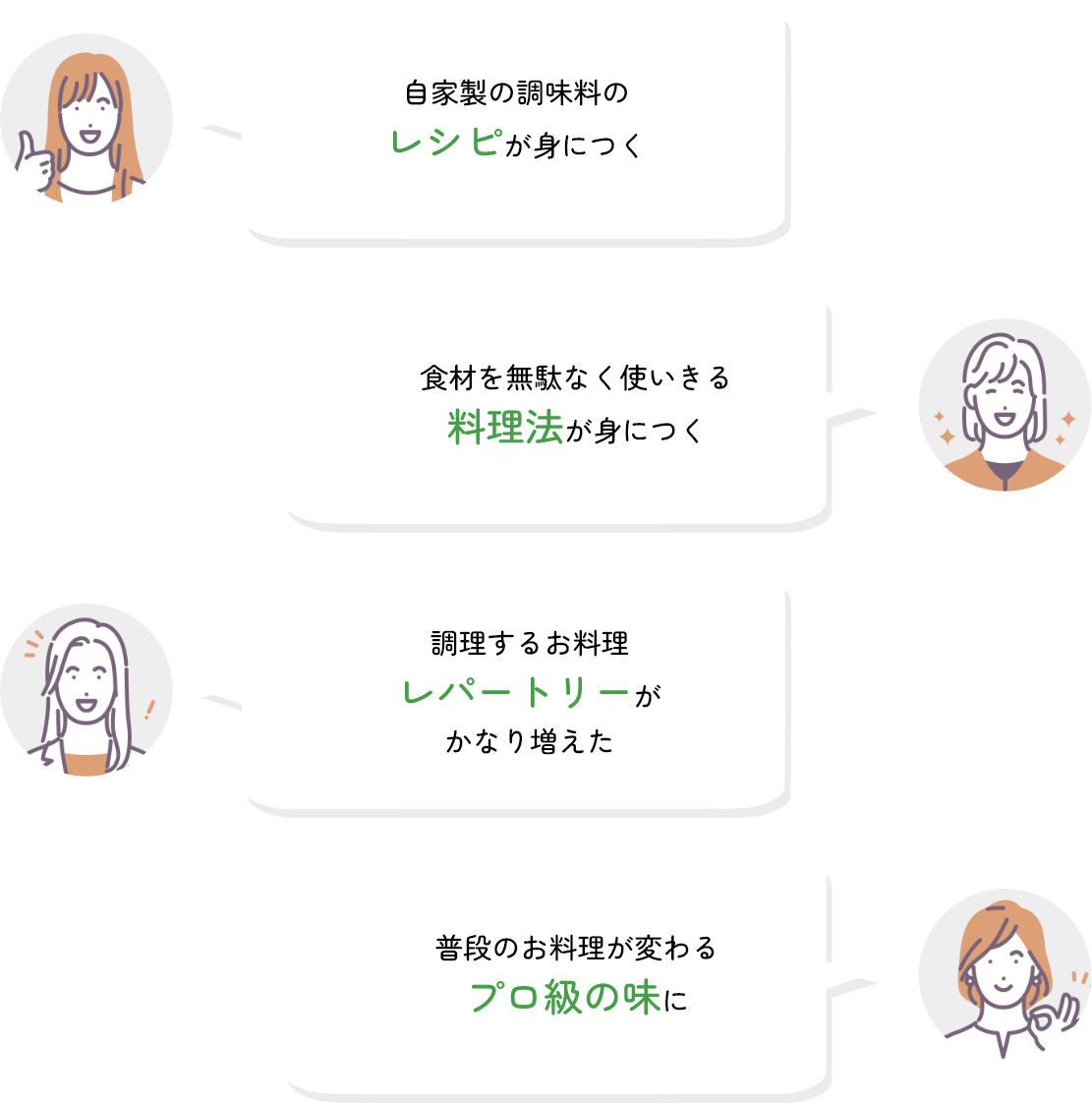 普段の調味料の選び方や自家製の調味料の配合、添加物や化学調味料に頼らない料理法が学べます。